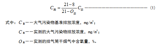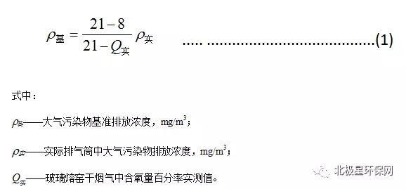 1.4 對于玻璃熔窯排氣(純氧燃燒除外),應同時對排氣中含氧量進行監(jiān)測,實測排氣筒中大氣污染物排放濃度應按式(1)換算為含氧量為8%狀態(tài)下的基準排放濃度,并以此作為排放是否達標的依據。其他車間或生產設施排氣按實測濃度計算,但不得人為稀釋排放。